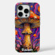 This painting presents a surreal, close-up view of a large, vibrant mushroom against a swirling, psychedelic sky. The artwork is chraacterised by its heavy impasto texture, with thick, expressive brushstrokes creating a tactile and dreamlike quality. The mushroom has a red-orange cap with white markings and a brightly coloured underside. The background is a dynamic mix of purples, pinks, and oranges, with floating spheres of orange, green, and yellow, along with stylised plant life at the base of the mushroom.