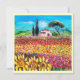 Tuscany landscape,vibrant,expressive beauty of Italian countryside and colourful flower fields,pink,fuchsia,purple flourishes,swirls,bright yellow orange,red,green,white colours,beautiful Summer meadows,cypress and olive trees,rustic old farm house under the blue sky.Acrylic painting on canvas .