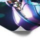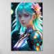 A character with turquoise hair adorned with pink flowers gazes intently, clad in futuristic armour glowing with vibrant colours. The background is a soft blur of green and light, highlighting the intricate details of the character's attire and facial features.