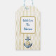 This floral gift tag has blue and pink anchors with flowers on the front over gold wavy lines. On the back, you'll see the same gold lines with a single blue anchor with flowers. There is a box where you can personalise your sentiment in blue to match the anchor. This matches our elegant anchor wrapping set and tissue paper.