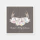 Paper napkins featuring an illustration of a pair of deer antlers decorated with a banner and pastel flowers. Personalise the text. Background is barn wood inspired. Look for matching invitations and other coordinating items at Jill's Paperie.