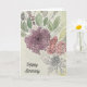 This graceful watercolor birthday card features a loose, hand-drawn floral arrangement in soft, muted tones. Delicate blooms in mauve, blush, and dusty rose are paired with leafy green accents and fine ink outlines, creating an artful, garden-inspired composition. The message “Happy Birthday” appears in an elegant script near the bottom, allowing the florals to remain the focal point.
