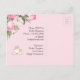 This design shows pink roses and white astromeyria arranged in tiny bouquets at the top and bottom corners of this postcard invitation. The back of the invitation gives room for the hostesses and RSVP plus a photo of a tea cup to show you are serving appetizers and need a head count.