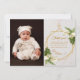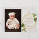 In the left half, there is a placeholder baby photo you must replace. In the right half, the text is written with golden letter in a geometric gold frame formed by two irregular gold hexagons that overlap, with a gold cross on top of it an flower bouquets of white calla lilies over it, up right and down left.. The title "Thank you!" and the ending with the name of the child are written in a calligraphic script, the main message in caps.The background (and the back) is white marble.