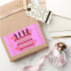 The dominant colour is a light, pastel pink, used for both the cake and the background pattern.