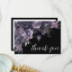 Dark Gothic Floral Wedding Thank You Card — a romantic and moody design perfect for a gothic chic celebration. The front features a mix of deep purple, dark gray, and black flowers and leaves over an off-white background with a black border. “Thank you” is written in elegant script on the front. On the back, the couple’s names and wedding date are displayed in classic serif fonts. Ideal for fall, winter, or gothic-inspired weddings.