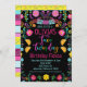 Colorful taco twosday second birthday party invitation featuring a decorative Mexican style floral elements, some taco's and a string of papel picado on a black background. This invitation design is sure to set the scene for a colorful girl's taco twosday 2nd birthday party.