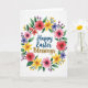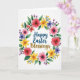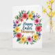 Designed with a springtime floral wreath encircling a friendly Easter greeting, this card keeps the focus on soft romance and companionship through gentle, close-knit blooms 🌷. Centred text reads “Happy Easter Blessings,” with “Happy Easter” in a calm deep blue and “Blessings” in a warm golden-brown, stacked neatly in the middle of the white space. The lettering sits comfortably inside a circular garland, giving the words room to breathe while still feeling hugged by the flowers. Around the ring, large open blossoms in coral red, sunny yellow, and rosy pink mingle like close friends leaning in for a photo. Smaller indigo and lavender flowers, plus little yellow buds, tuck into the gaps, adding a sweet, tender rhythm like quiet hand-holding between colours 🐰. Green leaves thread throughout in layered sprays, and light shading gives the petals a softly painted, watercolor-like look with a bit of depth. The wreath forms a full circle of mixed flowers and leaves on a bright white background, with the blue-and-golden-brown greeting centred inside.