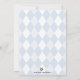 Celebrate the arrival of your new baby boy with this bright and cheerful blue and white floral design. The outside of the card features a blue and white diamond pattern with a blue background and blue floral designs, while the back of the card is a darker diamond pattern. The card is 5" x 7" and comes with an envelope.