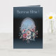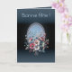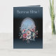 This festive card radiates a soft, luminous glow, set against a backdrop of azure blue that evokes the serenity of a clear sky. At its center, a bouquet of wild roses unfurls with elegance, blending rosy, greenish, and bluish hues in a delicate harmony. Each petal seems to breathe the freshness of morning, as if the dew had just settled upon them.