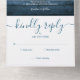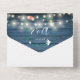 All in one wedding invitation featuring a pretty floral garland, string lights, signature style names and chic typography on a blue rustic wood background. The invitation includes a perforated RSVP card that’s can be individually addressed or left blank for you to handwrite your guest's address details. Designed by Thisisnotme©