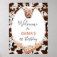 Cute cow themed birthday welcome poster in a bohemian style featuring a lovely boho floral arrangement with pampas grass, highland cow image and a brown cowhide pattern background. This boho floral highland cow party welcome sign is a lovely way to greet guests to your little girl's cow themed birthday party.