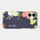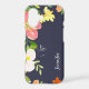 Bold, splashy watercolor floral images in pink, yellow, white and green cover the left side and top of the back of this phone case. The images are placed on a navy blue background, and a touch of orange at the bottom makes the design sing! Your name or other text is at the right side, or if you prefer, you may remove the text completely by clearing the field. *This design uses artwork from CreatetheCut.com.