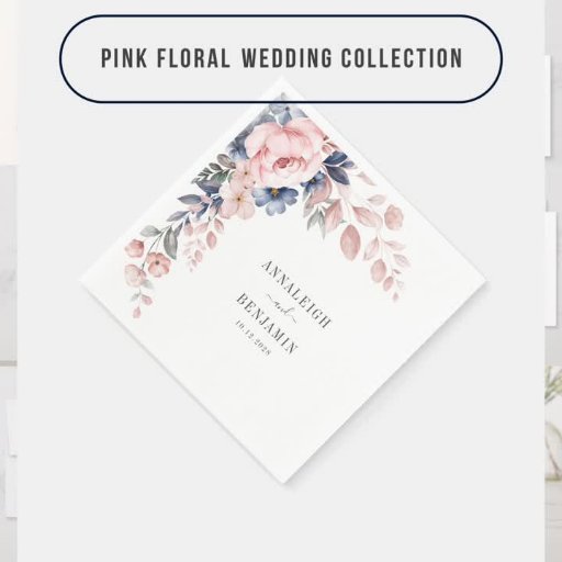 Plan your special day to the last detail cocktail napkins that features a modern design with pink and blue flowers, greenery foliage, and elegant dark grey typography. Easily change the details by clicking the "Personalise" button. Click the "Customise it" button to change the background, font type and arrange the text to match your preference and style