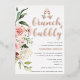 It has romantic pink roses on the side, "brunch and bubbly" text and two champagne glasses with bubbles in rose gold foil.