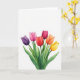 Designed with a watercolor-style bouquet of six closed flower buds rising from the lower edge on a bright white background, this card keeps the focus on simple natural beauty 🌷. The buds fan outward in a gentle arc, as if leaning towards one another like close friends sharing a quiet moment. Colours move across the blooms from deep purple and soft fuchsia to scarlet, crimson, tangerine, and golden yellow, with translucent washes that make each petal look softly layered. Slender green stems and leafy clusters in varied shades of green add depth and a grounded, garden-fresh feel. The generous open space around the bouquet gives the scene room to breathe, like an unspoken pause between two people who understand each other. A short greeting sits near the top in a light grey tone, leaving the flowers to carry most of the attention 🐇. The leaves show small, darker green brush marks along their edges and veins.
