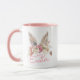 This Easter themed mug has bunny ears peeking out of a spring flower bouquet with the words "Happy Easter" in pink.