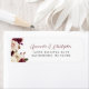 The left-hand border of this romantic modern wedding return address label features a watercolor floral bouquet in shades of burgundy and cream. The customisable text combines elegant modern burgundy handwriting script and charcoal grey sans serif font on a white background. Ideal for a fall or winter wedding.