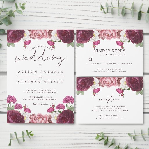 Beautiful Floral Burgundy Wedding design. Design is easy to personalise, if you wish to change fonts please Click to customise further. Colours are perfect for spring and summer weddings. You are welcome to visit my store for more beautiful products.