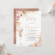 Bohemian inspired bridal shower invitation featuring some lovely bohemian style floral, pampas grass and palm leaf arrangement and tall glass. This design also features a faux rose gold petals and Prosecco heading.