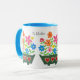 A pretty white coffee mug with blue lip and handle and window boxes of colourful flowers on all sides, from a handpainted paper collage by Judy Adamson. The text above, which you can change or remove if preferred, reads, 'To Mother With Love'. Matching Greeting Cards also available.