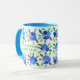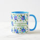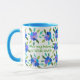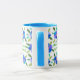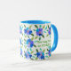 A very pretty white mug with a light blue rim and handle, decorated with a border of blue flowers front and back from a handpainted paper collage by Judy Adamson. Add your name to the text to make this your very own!