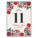 This Floral Colorful Botanical Flowers Spanish Wedding Table Number design showcases bold red florals, arranged in a balanced composition at the top and bottom edges, creating an inviting frame for text in the center. The flowers are complemented by stylized stems and leaves in shades of black, pink, blue, and green, adding depth and vibrancy to the overall look. The simplicity of the background highlights the rich, saturated colors of the floral elements, giving the design a lively yet elegant folk-inspired appeal.