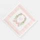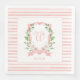 These adorable girl baby shower, sprinkle or sip and see dinner napkins would be perfect for celebrating your sweet baby. They have the party date below a peachy pink watercolor crest with her first initial surrounded by greenery and roses, your bundle of joy's first name, and a coordinating peachy pink watercolor striped edge. They're unique and precious just like your baby.