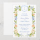 The card is adorned with a stunning watercolor floral crest frame, featuring a harmonious blend of cream, orange, and blue flowers interwoven with lush greenery. This artful arrangement creates a serene and inviting atmosphere, perfectly framing your wedding details with elegance and charm. At the top of the design lies a personalized monogram crest, symbolizing the union and love shared by the couple. This elegant feature adds a personal touch, making your save the date a cherished keepsake for your guests.