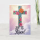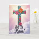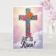 This design shows a tall, stylized cross centered on the card, with a textured, almost carved look that gives it depth. Bright pink and warm orange flowers cluster along the cross, their layered petals suggesting a gentle, affectionate embrace, while smaller teal floral shapes add a friendly, companion-like touch. Soft light-blue dots and accents sit around the blossoms, like little notes of celebration, with a 🌷 tucked into the springlike feel. Behind it, the sky fades from golden pink near the top into a calm lavender lower down, with thin clouds drifting across. Light rays spread from behind the upper part of the cross, forming a soft halo effect that draws your eye upward. Near the bottom, the words “HE IS Risen!” are placed in large lettering, set in a dark ink that stands out clearly against the lighter background 🐰. The cross rests on a deep gray-brown base that looks slightly grainy, with the teal details and pale blue circles scattered around it.