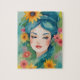 This vibrant and whimsical design features an abstract portrait of a woman with teal blue hair adorned with colourful flowers. Her serene expression is accentuated by closed eyes and red lips, giving her a dreamy appearance. Surrounding her are vibrant sunflowers, pink blossoms, and an array of green foliage, creating a lush, garden-like atmosphere. The piece has a soft, vector painterly style, giving it a modern yet romantic feel. The colour palette is dominated by teals, yellows, pinks, and greens, creating a harmonious and eye-catching composition.