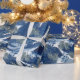 A deep blue rose fills the centre, surrounded by delicate leaves creating a harmonious, natural pattern. The light and dark shades of blue enhance the depth and contrast, giving a serene and calming effect.
