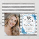Elegant floral feminine 50th birthday invitation with your photo. Glam, white and dusty blue design with faux glitter silver. Features stripes, light turquoise roses, script font and confetti. Perfect for a stylish adult bday celebration party. Personalise with your own details. Can be customised for any age! Printed Zazzle invitations or instant download digital printable template.