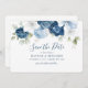 Elegant floral watercolor dusty blue, white, and navy floral bouquet wedding save the date card. The card features a script "Save the Date", that can be changed to a font type of your choice that are available here when you click the "Personalise" button.