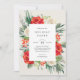 This classic holiday party design features red and white flowers against a neutral background with foliage, branches and berries.
