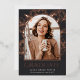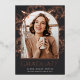 Elegant photo graduation announcement features a vertical or portrait orientated photo in a unique arched layout, on a charcoal black background with rose gold foil floral and botanical trim. "Graduate" appears beneath, along with your graduate's name and school or college. Add a personal message to the back, along with an additional photo.