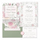 A soft, romantic frame of greenery and pink roses surround the details of this elegant wedding invitation. A monogram with the couple's initials sits at the top in the center and the wedding month and day is at the bottom, both can be removed and left blank. The color scheme is shades of pink, green, and white. The back of the invite is blank, keeping the main focus on the front.