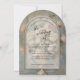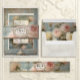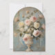 Vintage elegance, classical themed wedding invitation collection that features a Victorian era old master's Impressionist style painting of a blush pink and butter yellow roses in a floral bouquet set in an antique French urn vase over warm dusty blue Chateau wall background. An arch of gold and ivory metallic three dimensional looking frame with soft velum interior finishes the luxe timeless style. Impasto oil painted technique with crackled texture and a layer of script handwriting ephemera. This design was created and graphically designed by internationally licensed artist and designer, Audrey Jeanne Roberts, copyright.