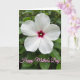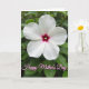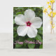 This card shows a close-up of a single white flower centered against a softly blurred background of green leaves, like a quiet garden moment shared between close friends ❤️. The blossom has five wide petals that open gently, with faint vein lines that add a tender, almost silky look. In the middle, a deep fuchsia tone shifts into a brighter crimson, drawing your eye inward like a warm, affectionate gaze. A small cluster of pale stamens sits in that colorful center, adding a delicate detail that feels intimate and alive. The surrounding foliage stays out of focus in layered greens, creating a calm setting that frames the flower without stealing attention. Soft natural light falls across the petals and edges, giving the white surface a gentle glow and making the center colors stand out. Near the bottom, a celebratory message appears in pink cursive-style lettering with a slightly darker outline, placed just below the image, with a tiny 🌼 accent nearby. The leaves behind the flower fade from darker green at the edges to lighter green closer to the center.
