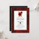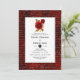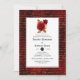 Crimson red and black gothic engagement party invitation featuring roses and a vintage gold typography pattern.