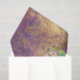 Romantic heart shape floral arrangement with gold, antique handwriting overlay over an abstract, pink, lavender purple, and gold paint wash.