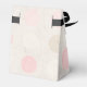 A wedding thank you favour bag. Customise with your name inside a blue-green ribbon layered over a charming heart filled with flowers and leaves in pink, green and yellow colours. The background is a faded pattern with circles in light pink and white. Summery and whimsical design. A white decorative label is layered over the circle pattern. Personalise with your names and wedding date.