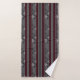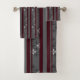 This design features black and white floral icons, maroon and black stripes, on a grey background.