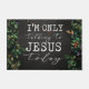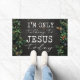 Our inspirational doormat adorned with a black wood and green floral background and text I'm Only Talking to Jesus Today. View our full line of custom home products in our Zazzle store.