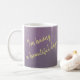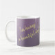 The mug features a purple to violet floral design. Text featured on one side and a beautiful purple and blue flower on the other.