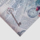 Newspaper print ephemera with vintage cars, sleigh and clock or pocket watch, vintage skeleton key, pink rose, and white diamond.
