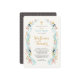 Beautiful wildflower-inspired Baptism invitation with a frame made up of blue laurels, pink wildflowers and gold accents. The delicate hand painted sprigs surround your text announcing your special day- with a cross at the top of the frame. In beautiful blues, pinks, golds and browns with birch wood grain on the reverse side.