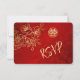 This traditional Chinese wedding RSVP card features a gold floral line art branch and a gold double happiness symbol on a shimmering red background.