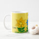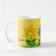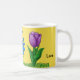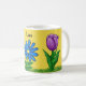 Pretty floral garden with golden yellow flower, blue yellow flower and purple tulip in the green grass. Love is written in black script around golden yellow mug. Pretty mug to brighten up someone's day. Original Graphic Artwork by TamiraZDesigns. www.zazzle.com/tamirazdesigns