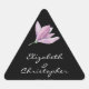 Personalised triangle stickers featuring a beautiful purple magnolia blossom watercolor and your text in chic white lettering on a black background, perfect for wedding party favours, bridal shower, wedding invitation seals and more. Available in different shapes. MATCHING ITEMS in our store.